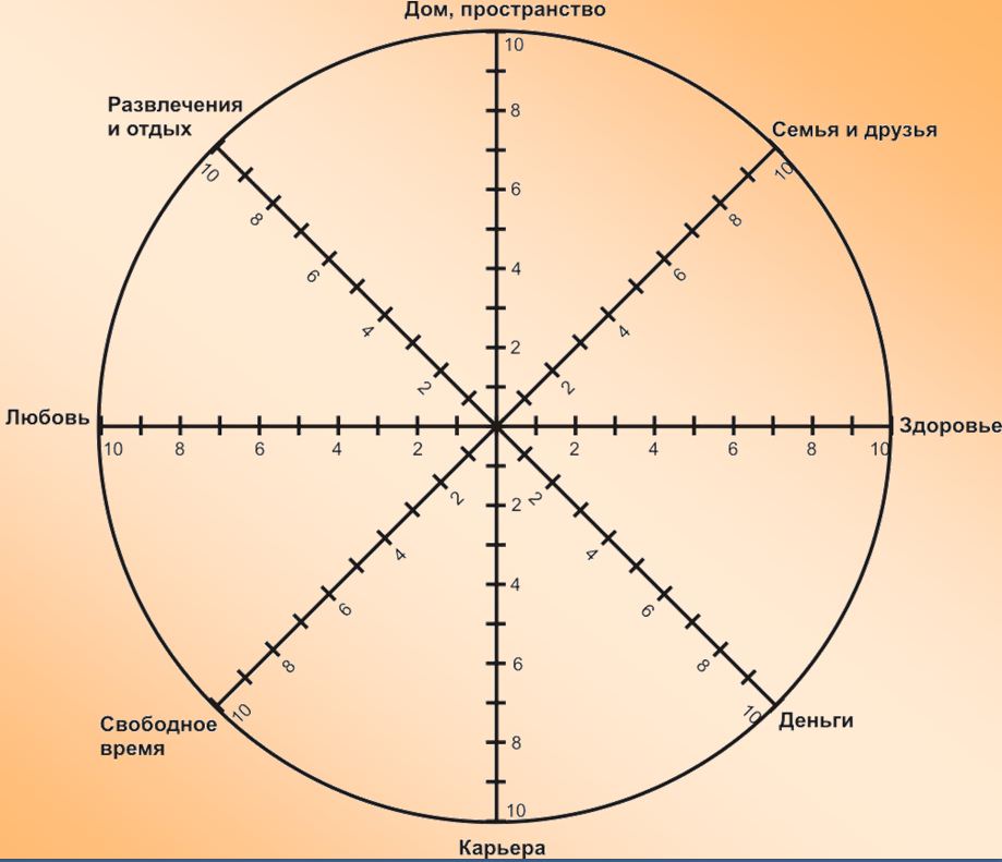 Круг, который вы видите, олицетворяет Колесо Жизни, и вам предлагается сделать пометки на каждой из осей этого колеса: насколько вы удовлетворены тем, что вы имеете, насколько вы реализовали себя в данном направлении. Дом и Окружающее пространство