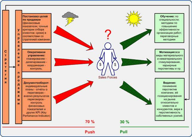 «Стратегические просчеты невозможно компенсировать оперативными успехами» В чем проблема? Результаты деятельности Компании могут быть улучшены как за счет инвестиций в расширение ассортимента и увеличения бюджетов на продвижение, так и за счёт оптимизации управления отделом продаж. «Контур» (набор методов) управления отделом продаж является неотъемлемой частью корпоративного «контура» и не может быть настроен отдельно. Любой руководитель хочет, чтобы отдел продаж его компании работал эффективно, в координации с другими отделами и приносил как можно больше денег. Руководители продаж - люди ответственные и отдают работе практически всё своё время и силы. Но в условиях ужесточения конкуренции (и роста всех видов затрат) на первое место выходят «инструменты», которые позволяют добиваться успеха в первую очередь за счёт правильной фокусировки усилий торгового персонала: затраты должны быть рентабельны. Отделом продаж достаточно сложно управлять. Специалисты по продажам (в дальнейшем я буду называть их Sales Forces) значительную часть своего времени работают вне офиса, и содержание их работы достаточно сложно оценить привычными методами. Как правило, это мало контролируемые, более или менее успешные люди, которым необходимо доверять. В результате топ-менеджмент предпочитает концентрировать усилия на разработке новых продуктов, оптимизации производства и разработке корпоративных стратегий, а отдел продаж фактически предоставлен сам себе. Как предполагается «по умолчанию», продажи должны воспоследовать за стратегией автоматически, либо за счёт привлечения в компанию «гениев продаж». Вам необходимо настроить систему управления продажами, которая обеспечит достойный уровень работы любого (!) сотрудника, чей набор «паспортных компетенций» соответствует уровню Вашего сегмента. От чего зависит эффективная работа отдела продаж? Если рассмотреть поведение отдельного Sales Forces, то можно выявить следующие «векторы влияния» : Источник:: «Amadeus Group Sales Forces TM» На поведение сотрудника намного сильнее влияют «методы принуждения» (левая часть схемы), чем методы поощрения (правая часть схемы). Правда, следует отметить, что указанная зависимость меняется по мере подъёма по иерархическим уровням компании. Поэтому получить полноценный долгосрочный эффект только от, например, семинаров для Sales Forces(даже качественных) маловероятно. Заметные для Владельца результаты могут проявиться после того, как будут эффективно решены вопросы «левой части» рисунка, иначе говоря - методик «целевого управления» с точным контролем не столько результатов, сколько промежуточных действий в соответствующих «ключевых точках». Безусловно, все элементы «позитивного воздействия» из правой части рисунка очень важны, но их внедрение и настройка дадут очень маленькую отдачу на Ваши инвестиции (Return On Sales). По моей практике, проводя аудит системы управления продажами, от руководителей зачастую можно услышать что-нибудь вроде: «Зачем мы должны тратить время на всякие бумаги? Надо хорошо работать и всё будет в порядке». С этим трудно спорить, просто никто не будет «хорошо работать» без внедрения достаточно «жёстких» элементов управления. Достаточно часто приходится слышать и такое: «Да, мы давно собирались это сделать, но как-то не доходили руки… Было очень много ра