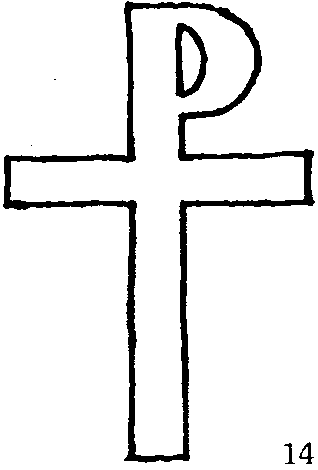 Рис. 13. Крест «монограмма Константина». Как известно, эта монограмма получила довольно широкое распространение: отчеканена была впервые еще на известной бронзовой монете императора Траяна Декия (249-251 гг.) в Лидийском городе Меонии (рис 13); была изображена на сосуде 397 года; вырезана была на надгробных плитах первых пяти веков или, к примеру, фресочно изображена на штукатурке в пещерах святого Сикста (Гр. А.С. Уваров, стр. 85). Крест монограммный «послеконстантиновский».