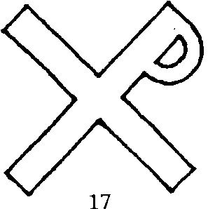 Рис. 12. Крест «монограмма Константина». Святому Царю Константину Равноапостольному «во сне явился Христос Божий с виденным на небе знамением и повелел, сделав знамя, подобное этому виденному на небе, употреблять его для защиты от нападения врагов» , - повествует церковный историк Евсевий Памфил в своей «Книге первой о жизни блаженного Царя Константина» (гл. 29). «Это знамя случилось видеть и нам собственными очами, - продолжает Евсевий (гл. 30). - Оно имело следующий вид: на длинном, покрытом золотом копье была поперечная рея, образовавшая с копьем знак креста (...), а на нем символ спасительного наименования: две буквы показывали имя Христа (...), из середины которых выходила буква «Р». Эти буквы Царь впоследствии имел обычай носить и на шлеме» (гл. 31). «Комбинация (совмещенных) букв, известная под именем монограммы Константина (рис. 12), составлена из двух первых букв слова Христос - «Хи» и «Ро», - пишет литургист архимандрит Гавриил, - эта Константиновская монограмма встречается на монетах Императора Константина» (стр. 344).
