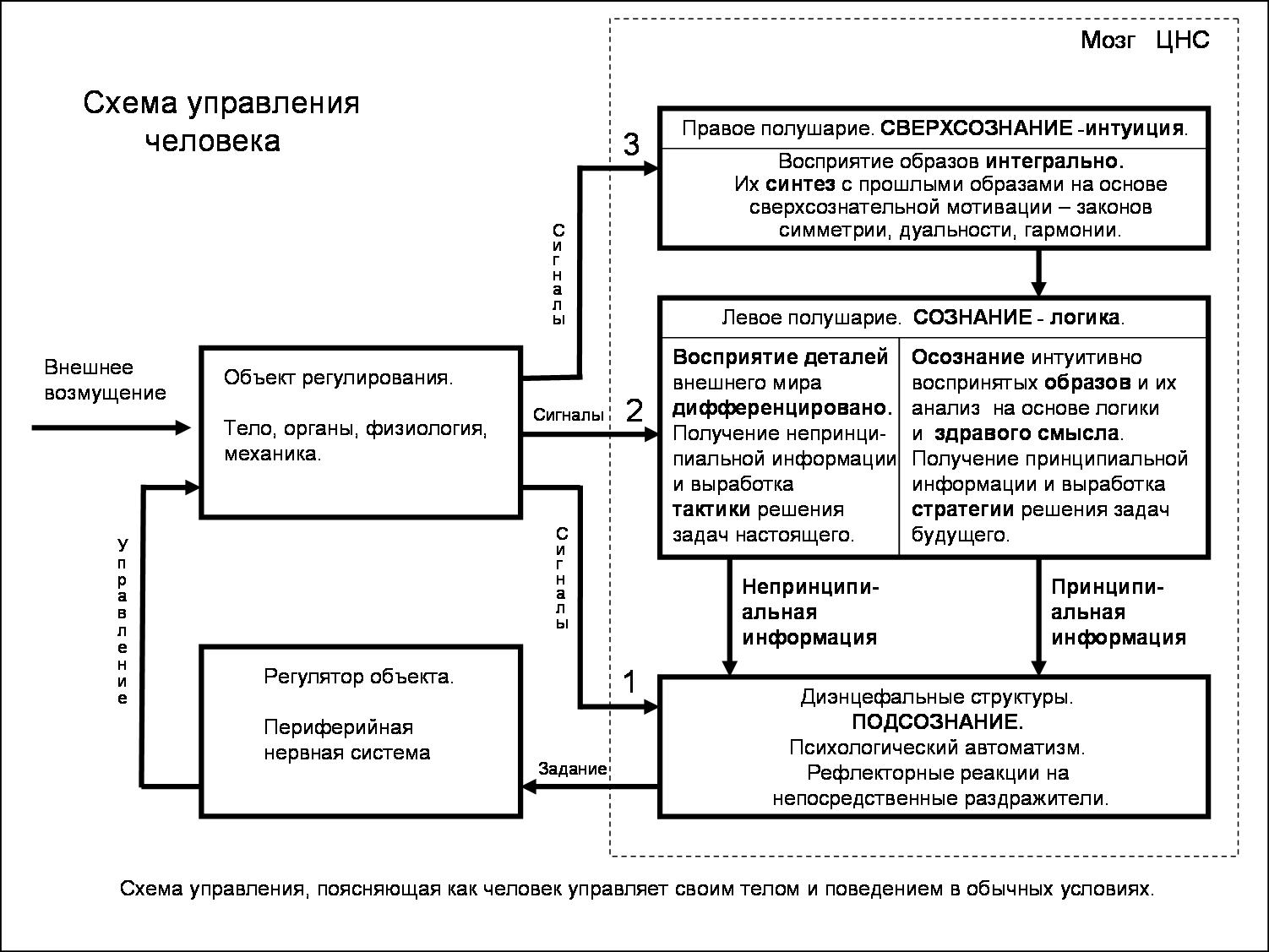 Патент США Human Subject Psychophysical Condition Diagnostics and Correction Method based on Wave Processes in Cerebral Hemispheres US Patent Office. Patent Application number 61614536 23-MAR-2012 Patent Application number 61804672 24-MAR-2013 Автор изобретения: Ануашвили Автандил Николаевич Формула изобретения 1. Метод диагностики и коррекции психофизического состояния человека, заключающийся в том, что измеряют доминирование одного из полушарий и согласованность колебательных процессов между полушариями головного мозга исследуемого человека и по измеренным значениям определяют его психологическую характеристику и вероятность его психосоматических расстройств; далее проводят коррекцию его психофизического состояния путем введения биологической обратной связи с двумя сигналами (образами), отображающими состояние двух полушарий головного мозга, чем запускают в мозге человека механизм психофизической саморегуляции, приводящий к выравниванию амплитуд и повышению согласованности колебательных процессов в полушариях головного мозга, что в свою очередь приводит к повышению устойчивости психических процессов, уменьшению вероятности психосоматических расстройств, а также - сближению и согласованности логических и интуитивных способностей человека. ВАРИАНТЫ РЕАЛИЗАЦИИ 2. Метод по пункту 1, отличающийся тем, что доминирование одного из полушарий определяют путем измерения разности амплитуд электромагнитного излучения левого и правого полушарий, а согласованность колебательный процессов определяют путем измерения уровня когерентности электромагнитных колебаний между полушариями. При этом принято, что доминирование правого полушария пропорционально положительному значению разности амплитуд для правого полушария, доминирование левого полушария пропорционально положительному значению разности амплитуд для левого полушария, а когерентность колебательных процессов между полушариями пропорциональна согласованности этих колебательных процессов. Аппаратно-программное средство для реализации п.2 заявляемого изобретения состоит из двух приемников электромагнитных волн, излучаемых полушариями головного мозга, фазового смесителя и вычислительного блока для определения доминирования одного из полушарий путем вычисления разности амплитуд электромагнитного излучения в полушариях и для определения уровня согласованностиэлектромагнитных колебаний между полушариями путем вычисления уровня их когерентности. Рис.1. Блок-схема устройства для определения доминирования одного из полушарий и согласованности между полушариями путем измерения электромагнитного излучения двух полушарий головного мозга и вычисления усредненных во времени разности амплитуд (доминирования) и когерентности (согласованности). Вычисляется также степень гармонии личности (Н). По результатам вычислений определяется психологическая характеристика человека, вероятность его психосоматических расстройств и компьютерная программа выдает рекомендации по изменению образа жизни и образа мыслей для гармонизации личности и взаимоотношений. МОДЕЛЬ ПСИХИКИ ЧЕЛОВЕКА Модель управления человека на основе 3-х уровневой структуры психики Из теории управления известна симметричная структура системы управления с обратной связью. Объект управления (регулирования) реагирует на внешнее возмущение, информация об измененном состоянии объе