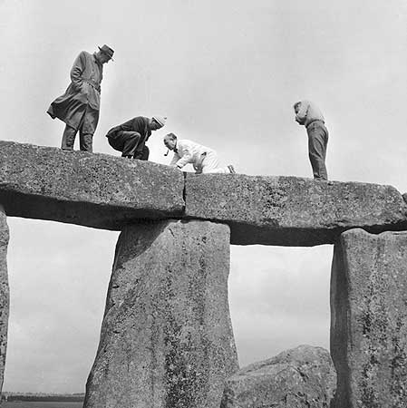 Далее, если рассмотрите снимки повнимательней, то найдёте и военных, и колючую проволоку в окрестностях, и другие детали, говорящие о том, что с определённого момента будущая "циклопическая постройка" древних друидо-атланто-асуро-сириянто-ариев была охраняемым режимным объектом. Увидите "представителей заказчиков", не являющихся чиновниками, строителями, рабочими, окрестными жителями. Найдёте "посвящённых" с кое-какими закладками, оборудованием. Стоунхенджу - "космическому порталу", "энергетическому кристаллу" и т.д., и т.п. отводилась важная роль в представлении, связанном с "апокалиптикой", "скачками" и прочим; об этом позаботились при закладке. До наступления же оного момента назначение сооружения - биологическое и духовное заражение. Которое проиллюстрировано современными фотоматериалами в конце данного поста.