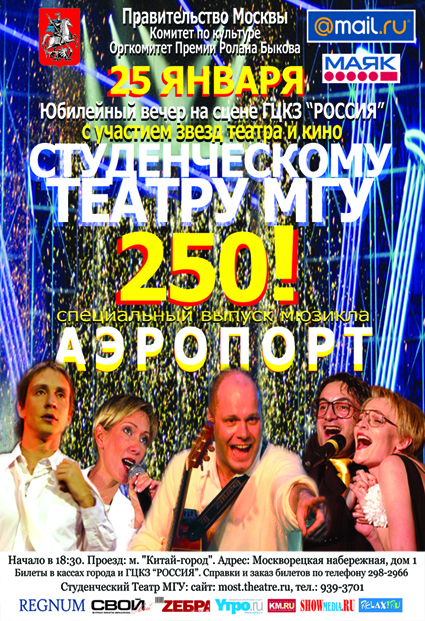 В январе 2006 года Театру Московского Университета исполняется 250 лет. Это первый публичный театр Москвы - предшественник Большого и Малого театров. В 1958 г. Ролан Быков реорганизовал театральный коллектив Университета в Студенческий театр МГУ. В настоящее время Студенческий театр МГУ под руководством Евгения Славутина стал мощным творческим коллективом. Воспитанники театра этого периода - Алексей Кортнев, Ирина Богушевская, Валдис Пельш, Максим Галкин, Антон Кукушкин и другие артисты. В 2006 году состоится ряд мероприятий посвящённых 250-летию театра. 25 января 2006 года в Татьянин день состоится Юбилейный вечер Студенческого Театра МГУ на сцене ГЦКЗ «Россия». Программа Вечера: I часть : Мюзикл «Аэропорт». Показ новой работы театра с участием Ирины Богушевской, Алексея Кортнева, Александра Данко и всей труппы Студенческого театра МГУ. II часть : Торжественная церемония вручения Театральной премии имени Ролана Быкова «Звезда пленительного счастья» за вклад в воспитание творческой молодежи и создание духовного образа нового поколения. Премия вручается знаменитым актерам и режиссерам Студенческого театра МГУ разных лет - Марку Захарову, Ие Саввиной, Алле Демидовой, Роману Виктюку, Георгию Васильеву и Алексею Иващенко, Ирине Богушевской и Алексею Кортеву, Максиму Галкину. Студенческий театр МГУ приглашает Вас посетить этот праздник. Билеты можно приобрести в Главном здании МГУ (тел.: 939 37 01) или в кассах города. Мы ждём Вас! Для тех, у кого есть желание и возможность оказать театру финансовую поддержку, мы оставляем наш Расчётный счёт. Любая Ваша помощь будет для нас очень важна, и мы заранее Вам благодарны. Реквизиты Студенческого театра МГУ