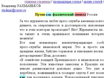 Редактор "Курсива" считает, что в своем последнем послании президент совершил со страной акт, о котором не подобает говорить в приличном обществе, и предлагает теперь продавать сувениры, на которых президент будет изображен в форме соответствующей части тела. По мнению Рахманькова, послание оказало неизгладимое впечатление на чиновников, которых он сравнивает со сперматазоидами. Однако все усилия президента и правительства пойдут прахом, считает журналист и объясняет: "Бабы - они не дуры". По мнению Рахманькова, пока завету Путина следуют только животные ивановского зоопарка, в том числе несколько редких видов. Как сообщила пресс-служба этого заведения, в этом году животные спариваются с невиданным оптимизмом. В общем, "добро пожаловать в зоопарк!", - этими словами заканчивается статья о президентском послании. Уголовное дело было возбуждено по статье 319 УК РФ ("оскорбление представителя власти") на следующий день после публикации. "Ивановская областная прокуратура отметила День пионерии", - откликнулся на эту новость "Курсив". По данным издания, в правоохранительных органах считают, что Рахманьков, который проходит по делу подозреваемым, унизил президента Российской Федерации Владимира Владимировича Путина. Следователи провели обыски в редакции и дома у Рахманькова. Были арестованы и изъяты компьютеры, в том числе домашний компьютер журналиста, а помещение газеты опечатано. Еще 19 мая провайдер по просьбе прокуратуры удалил с сайта интернет-издания скандальную статью. А во второй половине понедельника доступ к ресурсу был закрыт полностью. "Предоставление услуг приостановлено ввиду задолженности по оплате", - эту надпись теперь видят те, кто пытается попасть на сайт "Курсив". Впрочем, некоторые материалы газеты уже успели разойтись по Интернету и теперь гуляют по блогам. Так, статью "Путин как фаллический символ России" можно прочитать здесь. Сам Рахманьков считает заявление провайдера надуманным, поскольку все платежи, кроме текущих - майских, были внесены. "Это просто политический заказ, и газету пытаются убить по политическим мотивам", - цитирует Рахманькова интернет-сайт IvanovoNews. По мнению редактора "Курсива", статья представляет собой "безобидную сатиру", которую местная власть использовала как повод для того, чтобы расправиться с оппозиционным изданием. В последнее время "Курсив" неоднократно критиковал нового губернатора Ивановской области Михаила Меня. В апреле журналист пожаловался в прокуратуру на сотрудника аппарата правительства Ивановской области, который якобы его избил за критическую публикацию в "Курсиве". Поскольку заявление было подано через неделю после описываемых в нем событий, медицинское обследование не смогло подтвердить утверждение журналиста. На этом основании прокуратура отказала редактору "Курсива" в возбуждении уголовного дела. Рахманьков обращает внимание на то, что возбужденное против него дело может иметь неожиданные последствия - юридическая процедура рекомендует заслушать мнение оскорбленного должностного лица. "Это веселый казус. Есть шанс, что в Ивановскую область приедет президент по этому поводу", - говорит журналист. Уже известно, что его адвокат намерен заявить ходатайство о привлечении в качестве свидетеля потерпевшего, то есть главы государства. При этом Рахманьков уверен