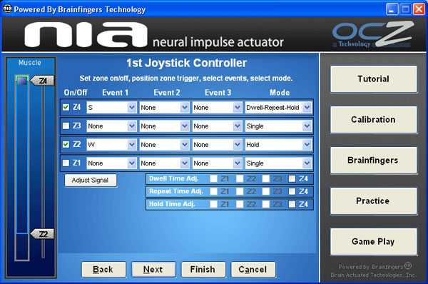Название Neural Impulse Actuator говорит о том, что устройство является преобразователем электрических импульсов мозга в команды, пепредаваемые в компьютер через драйвера и ПО. Но первое, с чем придется столкнуться пользователю - это управление не мыслями, а мимикой - мышцами лица. Для того, чтобы научиться управлять ритмами мозга, потребуется довольно продолжительное время, а, к примеру, щелкать зубами для выстрела в игре, сможет каждый и сразу. Именно поэтому производитель и добавил в NIA этот вид управления, никак не связанный с названием устройства.